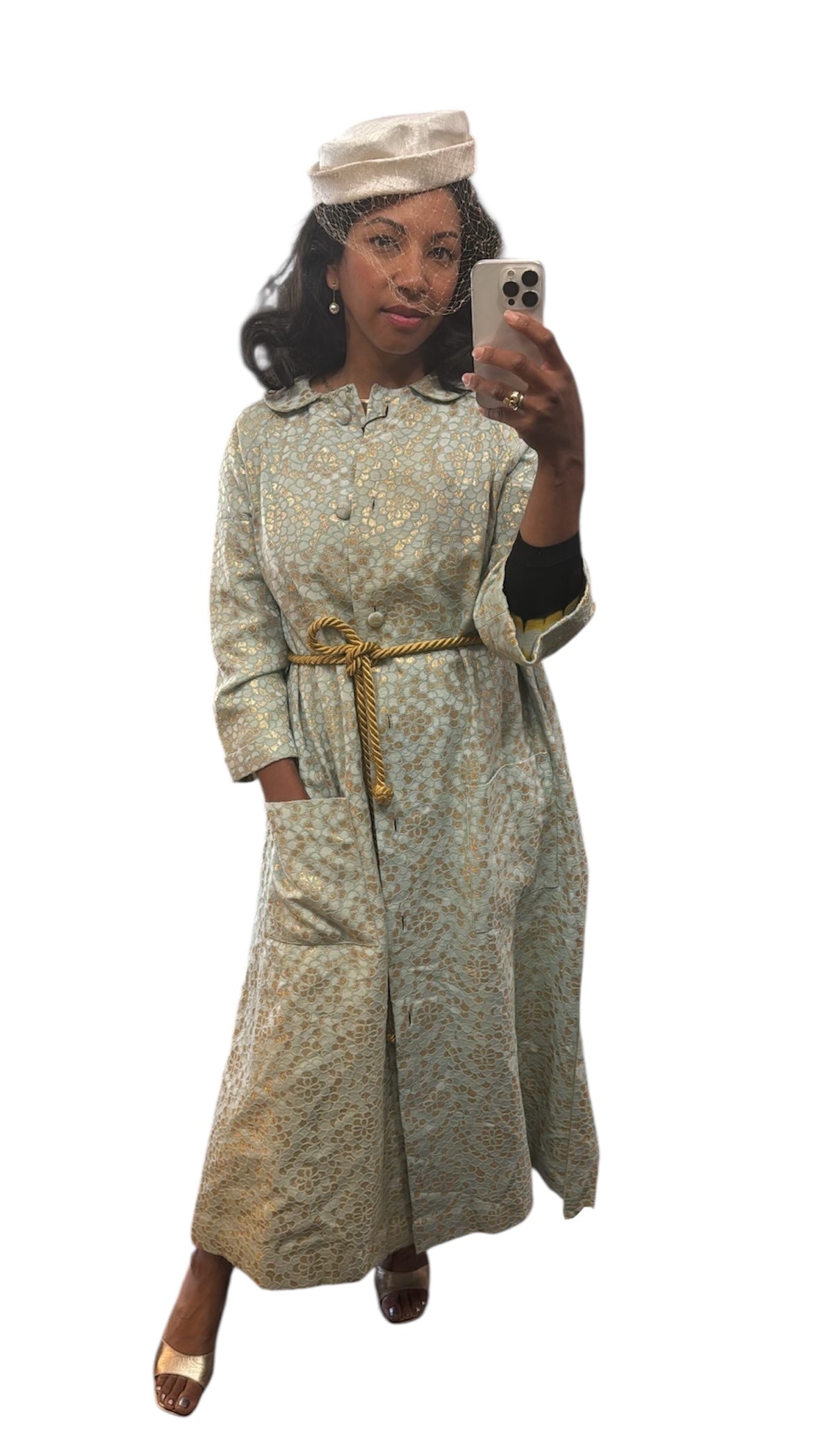 Vintage 50’s evening handmade coat, gold rope belt. size 10 runs small.