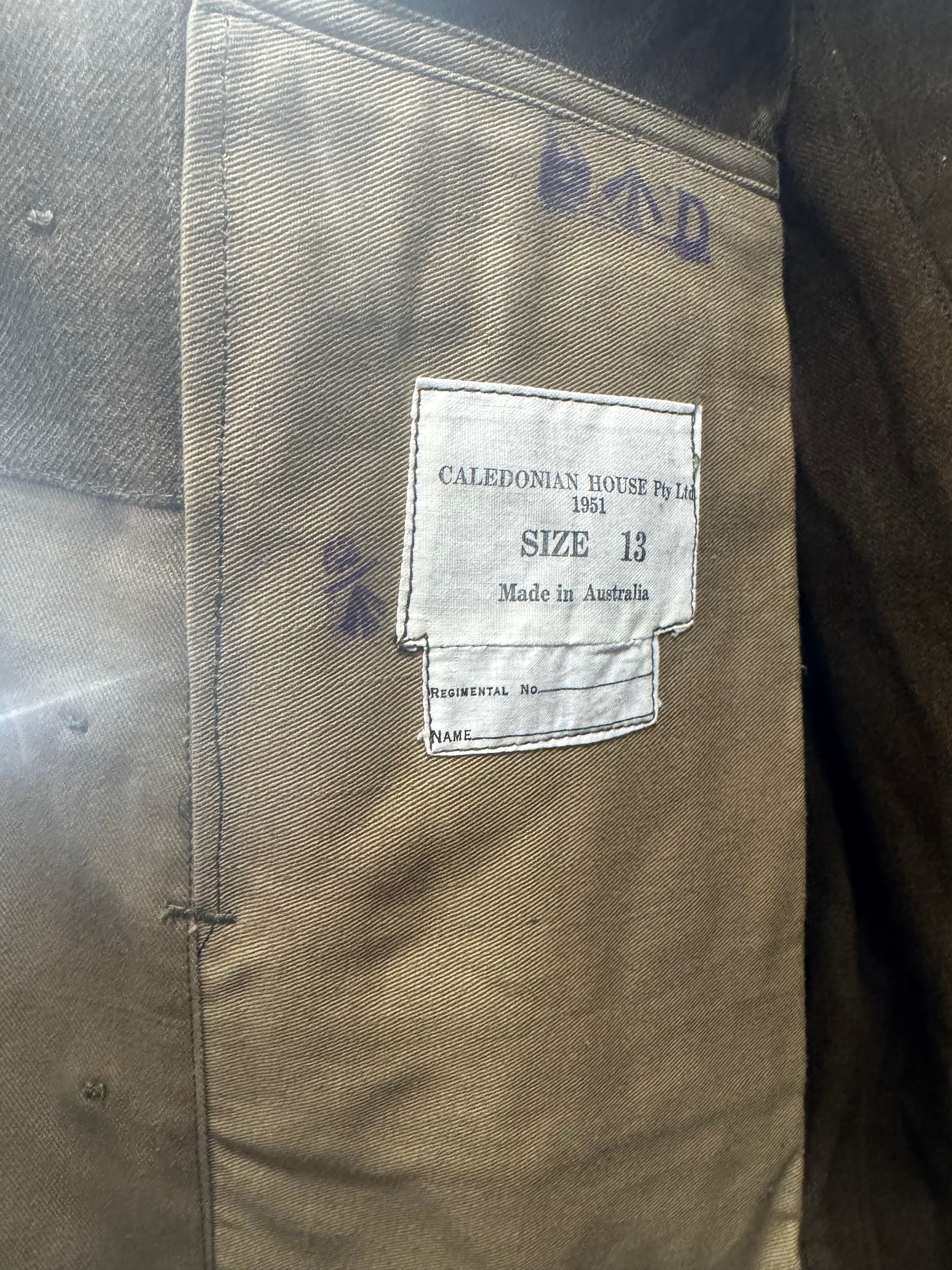 Rare Vintage 1951 Caledonian military jacket Made in Australia. Mens small, women’s M, Impeccable condition like new. Olive green lightweight wool fabric with brown buttons. Large interior pockets.