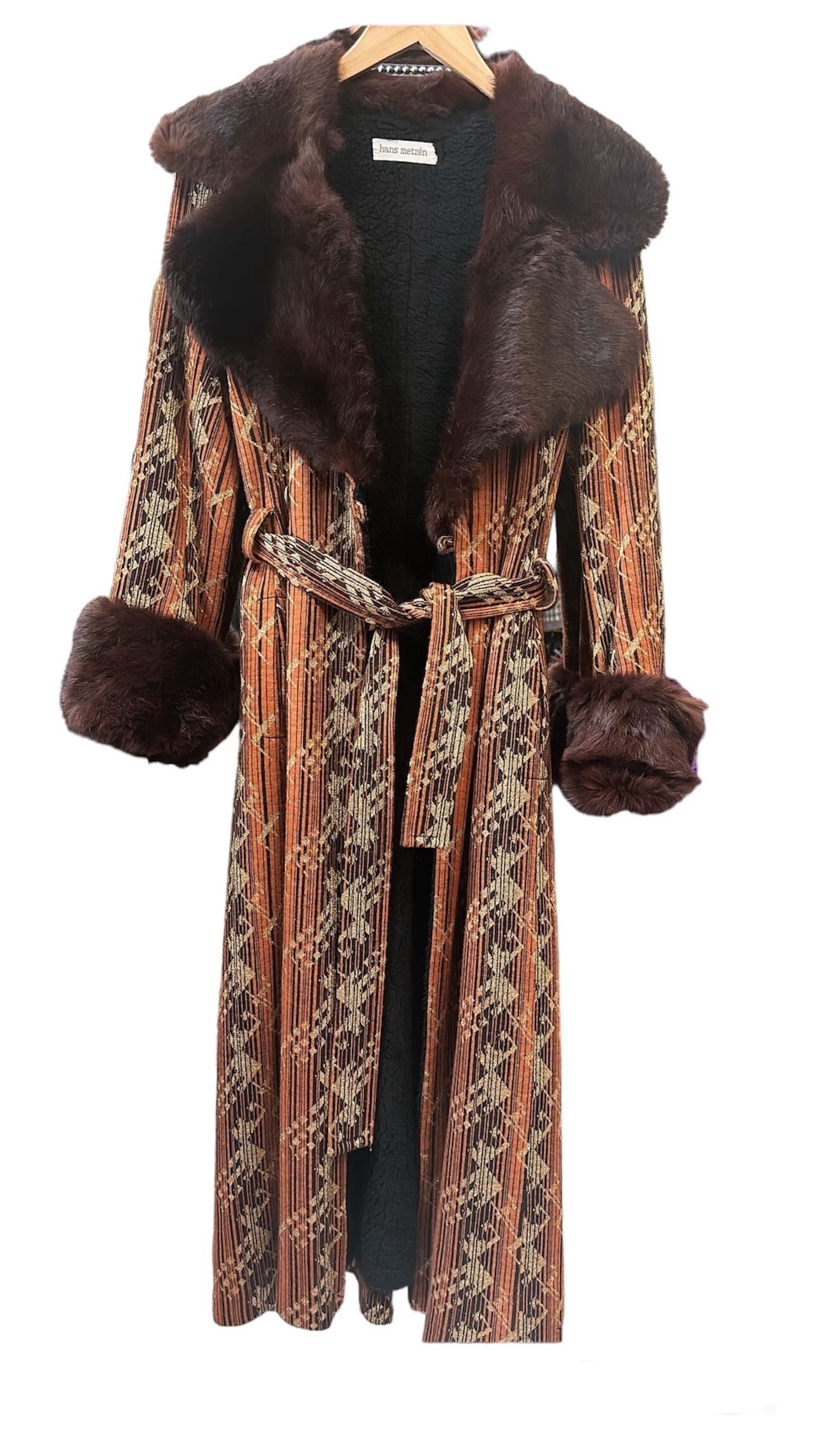Vintage 60-70’s Hans Metzen fur trim coat. Metallic gold, orange, black, real dark brown fur, black fleece lined. Size small will fit size 0-4.